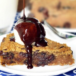 Take off the springform top, and serve the deep dish chocolate chip cookie cake hot, topped with ice cream or whipped cream and hot fudge sauce.
