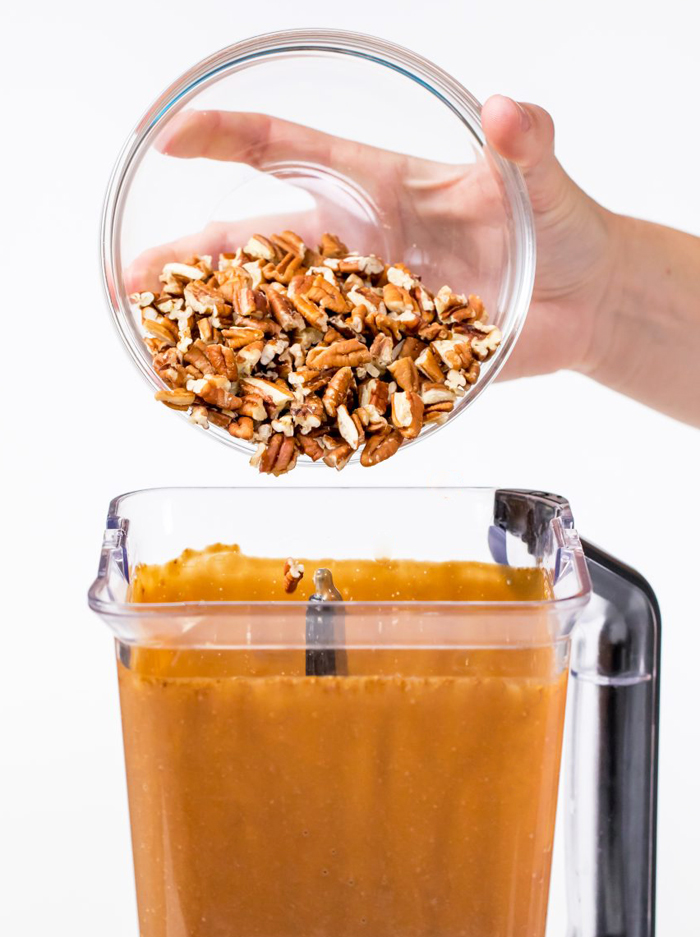 - Blend all ingredients, except pecans, in a food processor until very smooth. Then add the pecans and pulse a few times until they’re chopped. Pour into a prepared pie crust, and top with additional pecans if desired. Bake in a preheated oven at 350 degrees, for 45 minutes. If you serve the pie immediately, it’ll be very gooey (not necessarily a bad thing). But if you let it chill in the fridge, it firms up quite nicely the longer it sits. The pie fills up a prepared graham-cracker crust. If your crust is bigger, you might want to make 1 and 1/2 servings or even double the recipe. I cut this pie into 9 slices for the party, but that was because people often prefer “taste-size” slices at parties with many desserts. I’d say this recipe could comfortably serve six.View Nutrition Facts