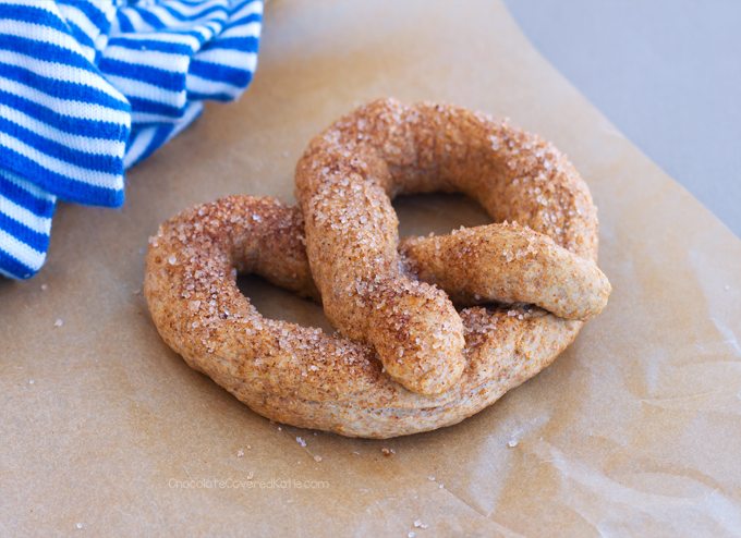 • Cinnamon Sugar Pretzels: melt some of your favorite butter-type spread or coconut oil in a shallow dish, then dip the hot pretzels into the spread. (For a fat-free version, you can spray them with oil spray instead. They just won’t be anywhere near as rich and buttery!) Immediately dip into a mixture of cinnamon and sugar (or xylitol).