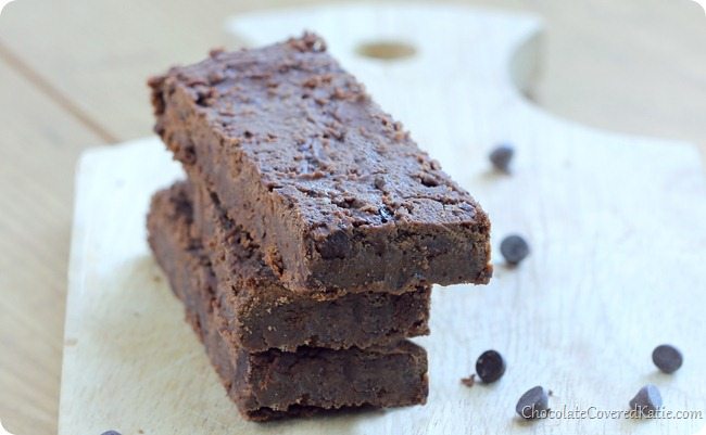 Homemade Chocolate Protein Bars: Preheat the oven to 350 F. Combine all ingredients except chips in a high-quality food processor, and blend until absolutely and completely smooth. (A blender works if you absolutely must, but the texture and taste will be much better in a food processor.) Stir in the chocolate chips. Pour into a greased 8×8 square pan. Optional: sprinkle extra chocolate chips over the top. Cook the homemade chocolate protein bars 16 minutes. They will still look underdone when you take them from the oven, but this is okay. Let cool, then pat down with a pancake spatula. Refrigerate overnight. The bars will have firmed up and are now ready to cut and eat. Store leftovers in the refrigerator. Makes about 10 bars.
