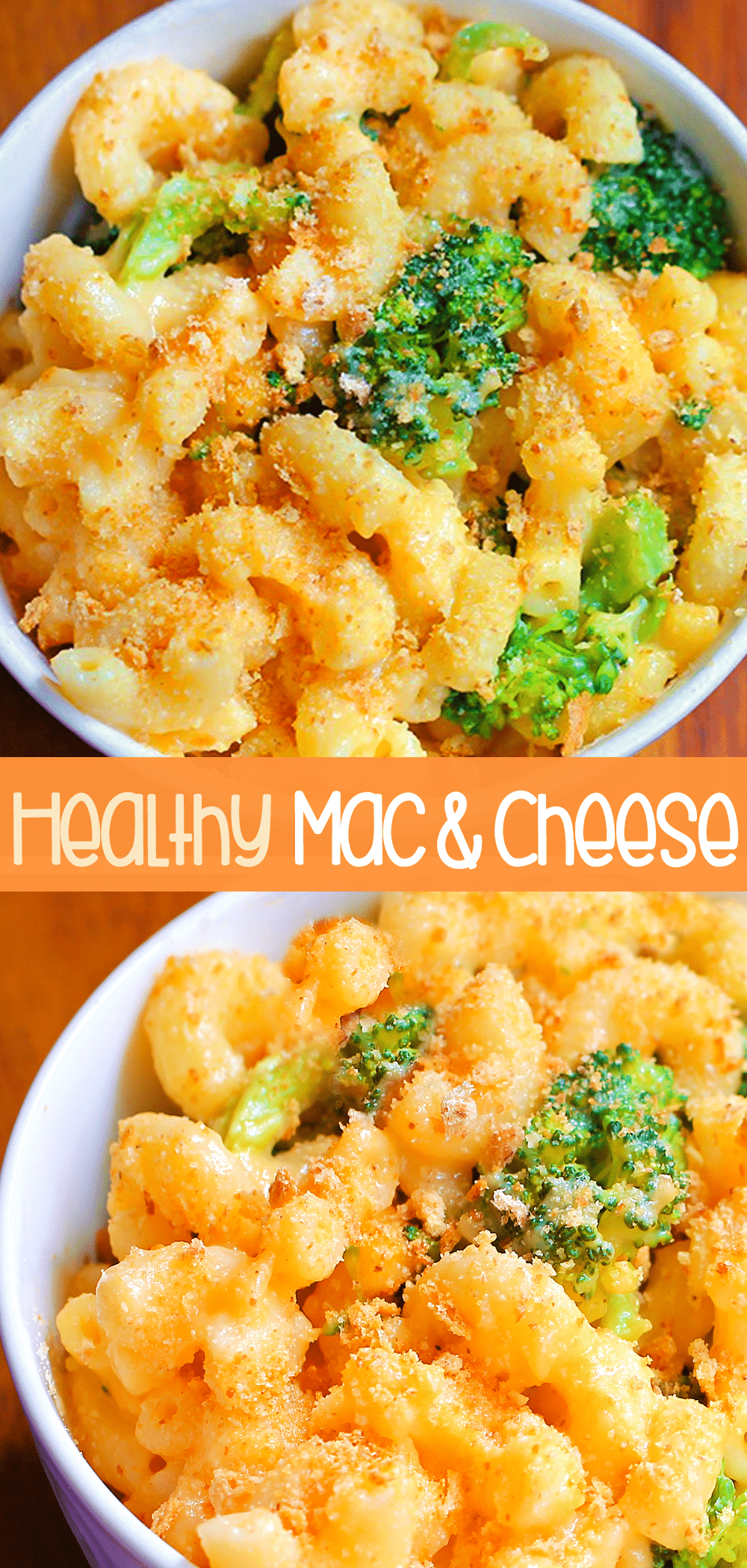 - Healthy Mac and Cheese Recipe: In a large pot of salted water, cook the pasta and broccoli together, according to package directions for al dente. Spray a baking dish with cooking spray, and set aside. Preheat oven to 375 F. In a large. heavy skillet, melt the buttery spread, then add the onion and cook over low heat for 2 minutes. Add the flour and cook 1 minute or until flour is golden and well-combined. Whisk in milk and broth, raise heat to medium-high until it comes to a boil, then cook an additional 5 minutes or until smooth and thick. Season with salt and pepper if desired. Remove from heat, add cheese, and stir until melted. Stir in the cooked pasta and broccoli, then pour into the prepared baking dish. Top with the breadcrumbs and Parmesan or nutritional yeast. Spray a little more cooking spray on top. Bake 15-20 minutes, then broil a few minutes until the breadcrumbs are golden.View Skinny Mac & Cheese Nutrition Facts