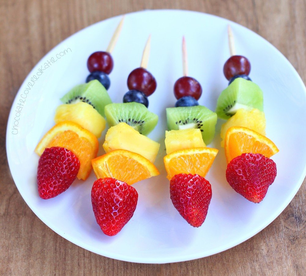Wash and slice all fruit. It’s best to use fresh fruit if serving these fruit kabobs to company, but frozen fruit can be used if presentation is not a concern. Insert the fruit onto skewers (available at grocery stores near the paper cups and napkins). Serve plain or with dip of choice.