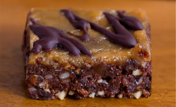 *Notes: If you have a small or medium food processor, it may be a good idea to process in two batches so as not to overwork your machine. Using a blender might yield an overly sticky result, so try that at your own risk. Recipe: In a high-quality food processor, combine all but the final three ingredients (but including the chocolate chips, if using) until sticky crumbles form. If it’s still too crumbly to stick together, process longer. Line an 8-inch square pan with parchment paper, then transfer the crumbles to the pan and use a second sheet of parchment to press down evenly into the pan. In a small dish, stir together the final three ingredients to make a frosting – it will look liquidy at first, but just keep stirring. Spread the frosting over top, then set in the fridge until ready to cut and serve. You can also drizzle melted chocolate on top if desired. I let mine sit in the fridge for a few hours, then I was easily able to slice and place the brownies in a sealed container to bring to a party. Store leftovers unrefrigerated for a few days, or refrigerated a few weeks, or frozen for up to 2 months.