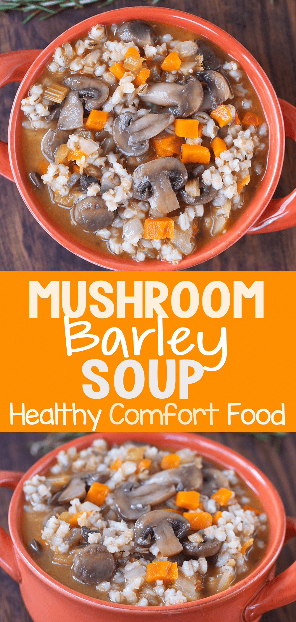 The recipe calls for vegetable broth, minced garlic, sliced mushrooms, onion, carrot, optional celery, pearl barley, salt, dried thyme, and rosemary.