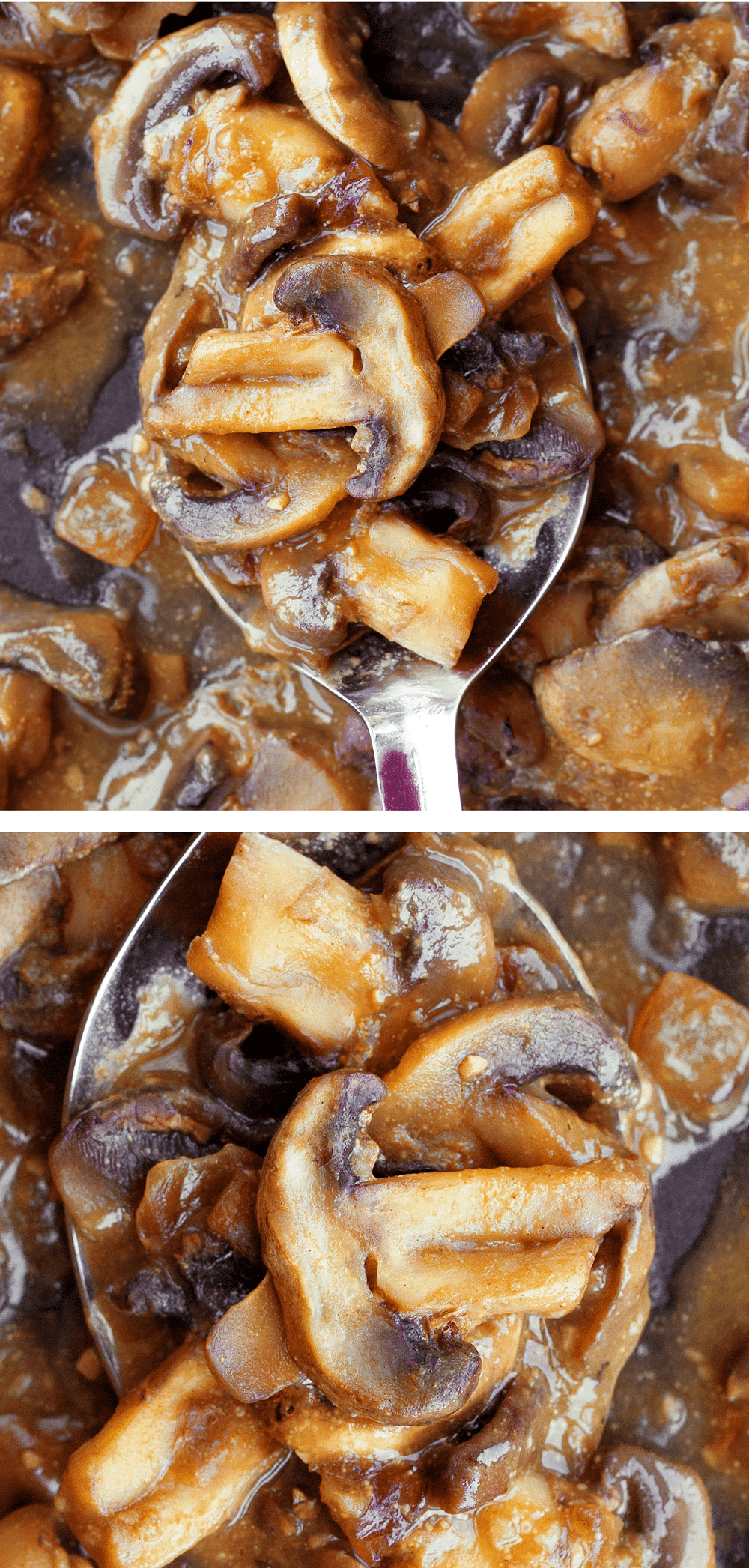 The recipe can be made with just a few staple ingredients: diced onion, fresh mushrooms, vegetable broth, minced garlic, a little salt, and your favorite thickener of choice. No drippings or meat juices necessary.