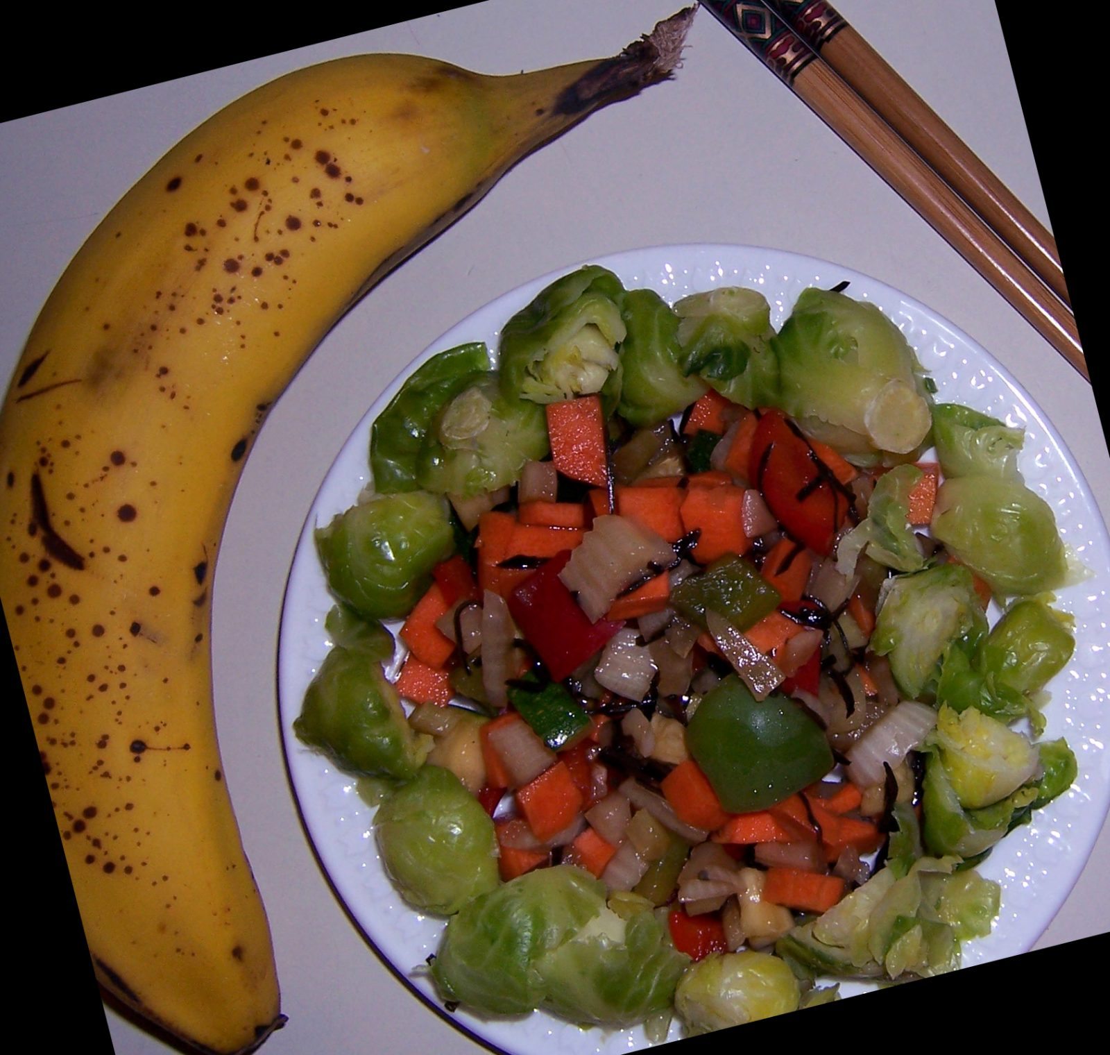 Soak the arame in water for 5 minutes. Drain. Cut the raw veggies into bite-sized pieces and add them to the arame. Then add the vinegar and shoyu (equal parts vinegar and shoyu), and mix well. Serve cold. Best if first served the next day, to give the veggies time to “marinate.”