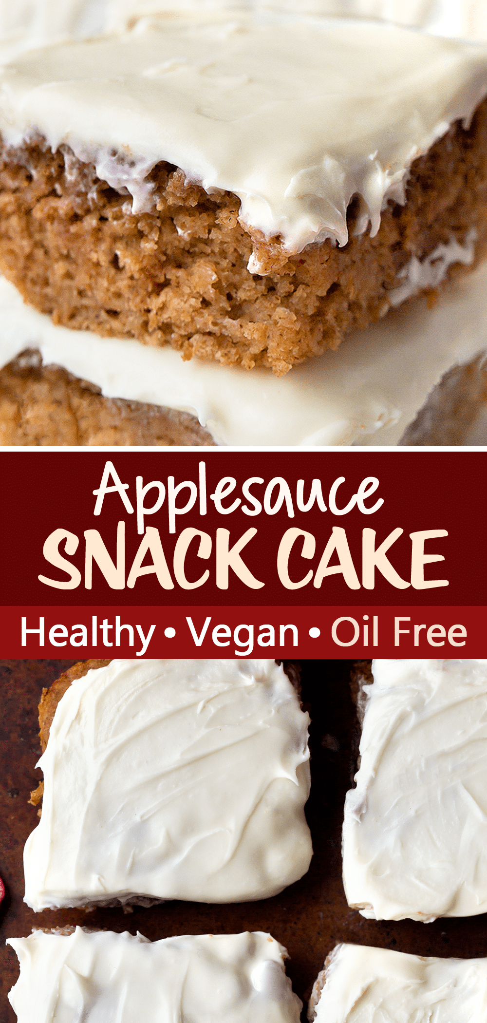 The cake is easy to make and kid friendly, with no eggs or dairy required. It can even be oil free. This is a really great way to use up extra applesauce.