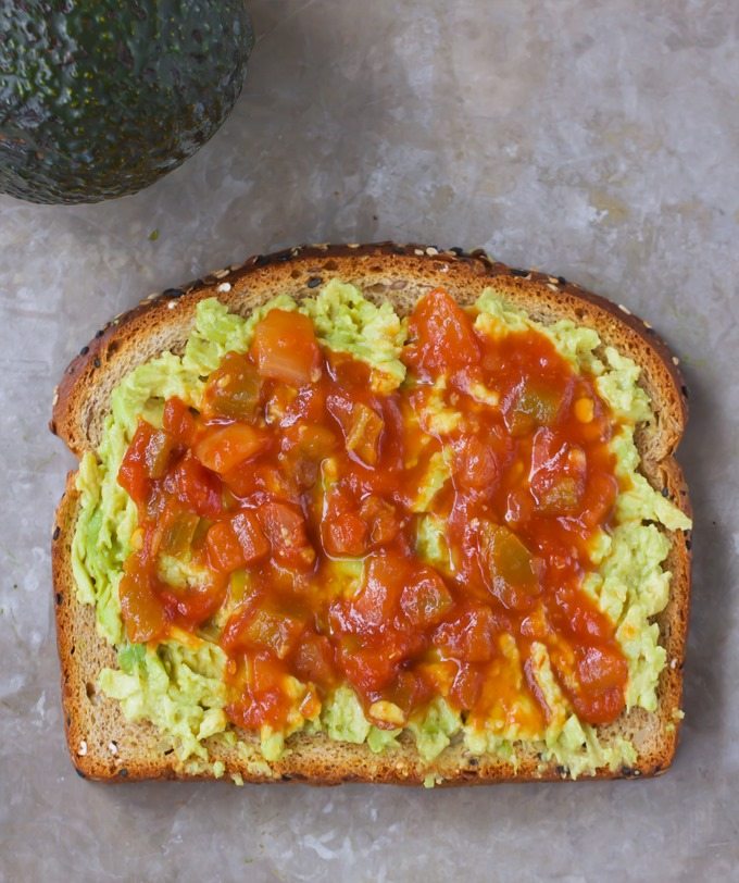 In a mixing bowl, stir together all ingredients except bread and avocado. Mash the avocado, and spread 3-4 tbsp on one slice of bread (toasted if desired), then spread 3-4 tbsp of the salsa mixture on top of the avocado. Top with a second slice of bread or toast. Repeat for however many sandwiches you wish to make. Store leftover salsa covered in the fridge for 4-5 days, or freeze for up to 2 months.