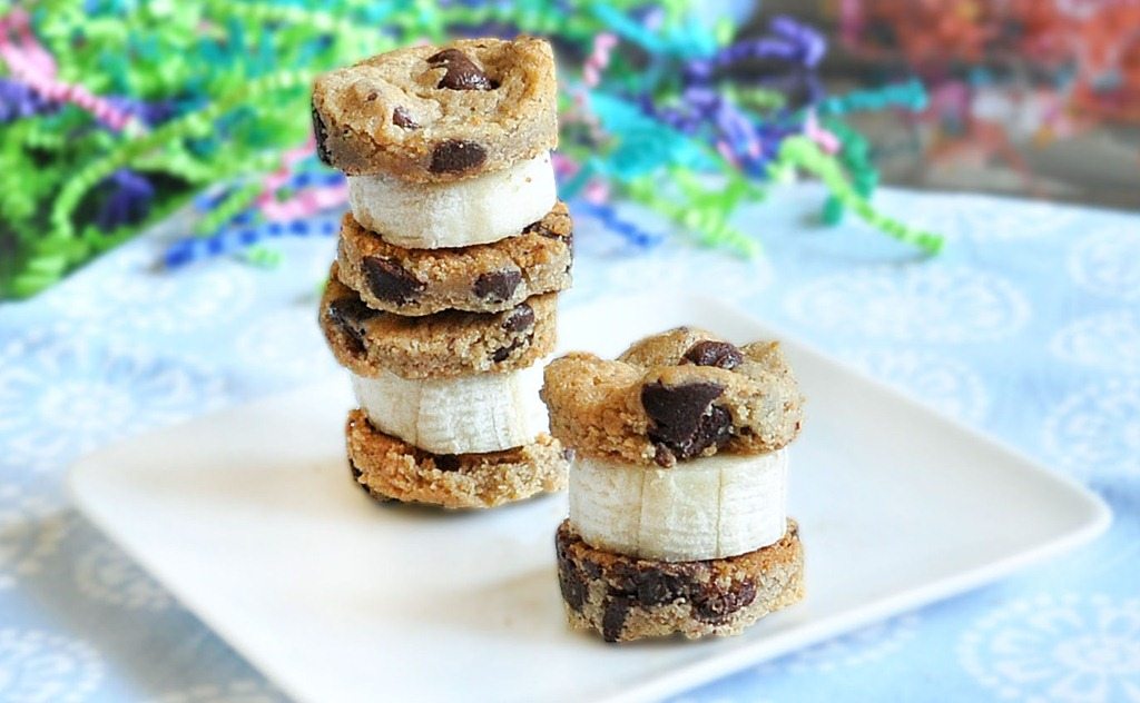 Preheat the oven to 375 degrees. Mix your dry ingredients, then add in wet. Form baby-sized cookies OR big cookies and bake 6-8 minutes. Take out when still underdone–they’ll continue to cook while cooling, and so you don’t want them to get hard. (If you made big cookies, you can use a circle-shaped cookie cutter to achieve baby cookies.) To serve: sandwich a banana slice between two cookies. If possible, do this at the last minute so the bananas stay fresh. For a variation, replace banana with sliced strawberries!