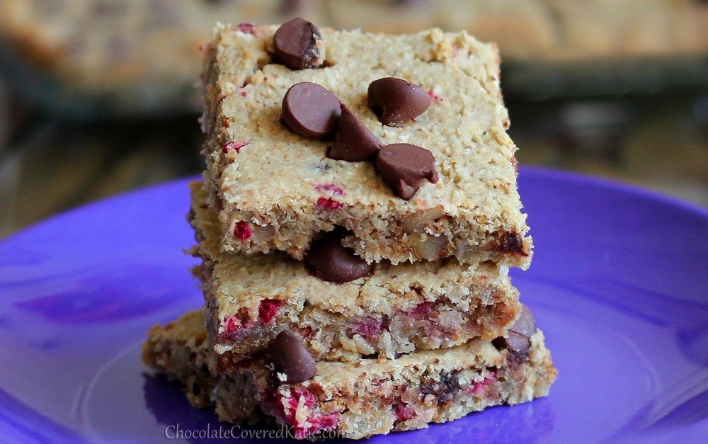 Preheat oven to 350 F and grease an 8×8 square pan. Combine the first 11 ingredients in a food processor (not a blender), and blend until completely smooth, scraping down the sides as necessary. Stir in the remaining three ingredients, transfer to the pan, and sprinkle some extra chocolate chips on top, very lightly pressing them down into the batter. Bake 30 minutes, then let cool completely before cutting into chocolate chip squares or chocolate chip bars. For troubleshooting, see the FAQ page at the top of my blog; and feel free to make changes to the recipe, but at your own risk.