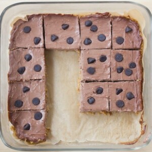 Preheat oven to 350 F. Fill a large baking pan about halfway up with water. Place it on the oven’s lower rack. Line an 8-inch baking pan with parchment. Beat all ingredients (except chips) in a blender, food processor, or hand blender just until smooth. (Overbeating introduces air bubbles that could burst and cause cracking.) Stir in chocolate chips now, or save them for later if you prefer. (Optional crust: process 5 graham cracker sheets with about 2 tbsp oil, then spread in the lined pan. Or use any of the crust recipes mentioned earlier in this post.) Spread batter into pan, and place on the center rack, above the water pan. Bake 25 minutes, then do not open the oven, but turn the heat off and let sit an additional 5 minutes. This helps the cheesecake cool gradually so it doesn’t crack. Take out the still-undercooked bars. Let cool at room temperature 1 hour. Then refrigerate overnight, during which time they will firm up quite a bit. Slice into bars the next day, wiping the knife between cuts. Refrigerate or freeze leftovers in a covered container.