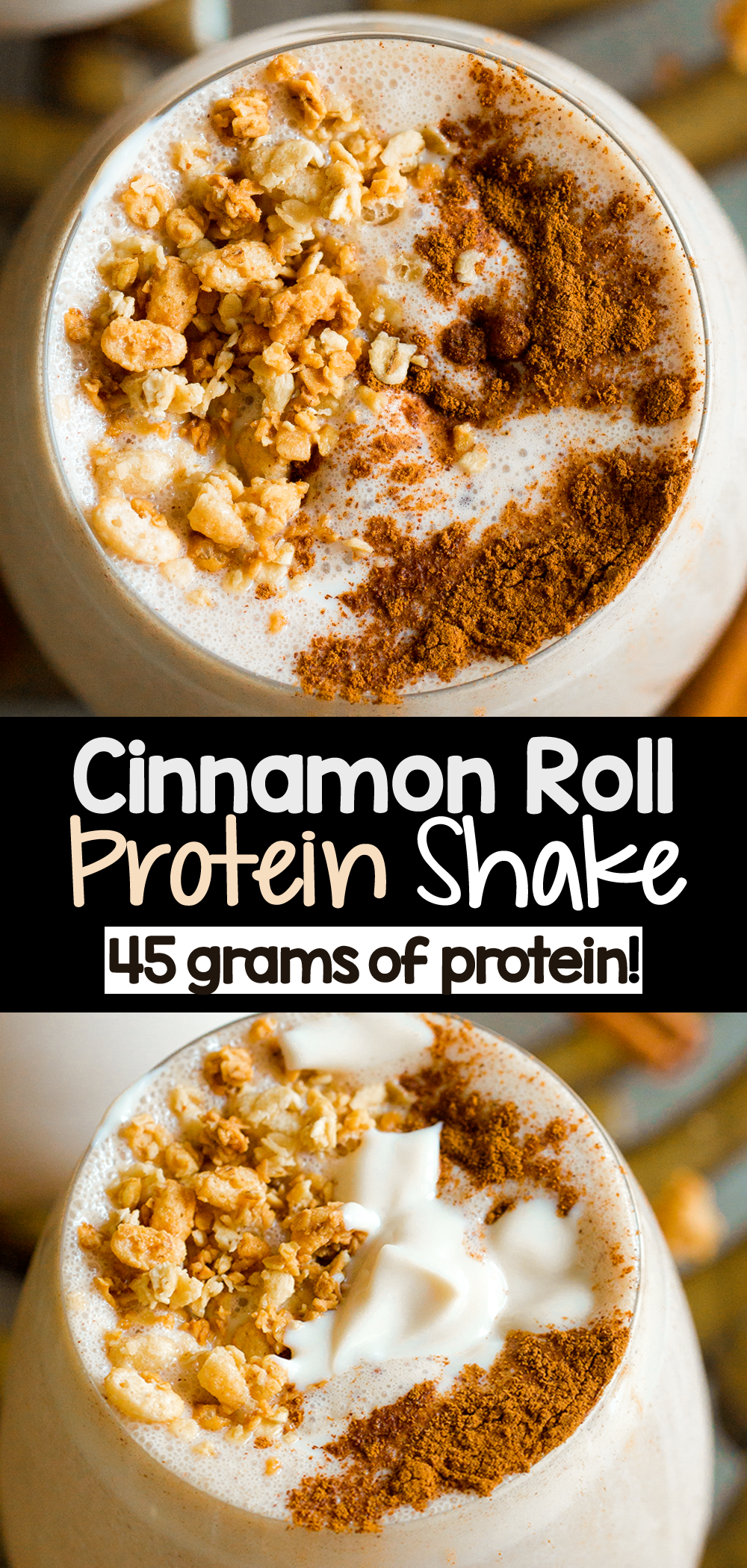 Whip up this thick and frosty cinnamon roll protein shake recipe in seconds. It is packed with over 45 grams of protein!