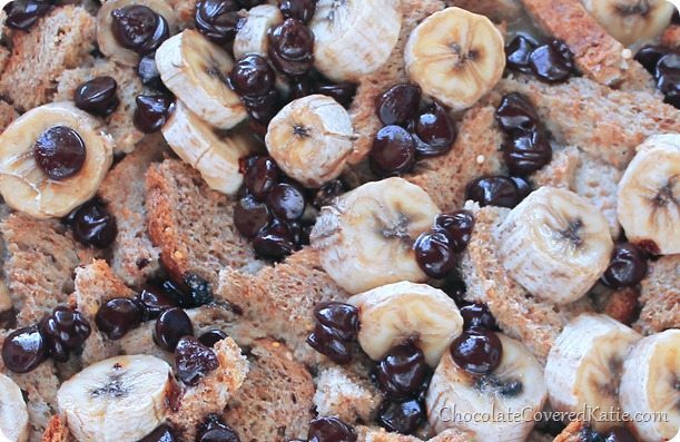 The book, which comes with complete nutritional information for every recipe, is divided into ten chapters from breakfast to dessert. It also covers topics such as how to be a healthy vegetarian, eating vegetarian on a budget, and making fast-food and holiday recipes. Upon receiving the cookbook in the mail, I right away bookmarked at least fifteen things I wanted to make. With bananas, cinnamon, and chocolate chips, this healthy bread pudding was obviously on top of the list!