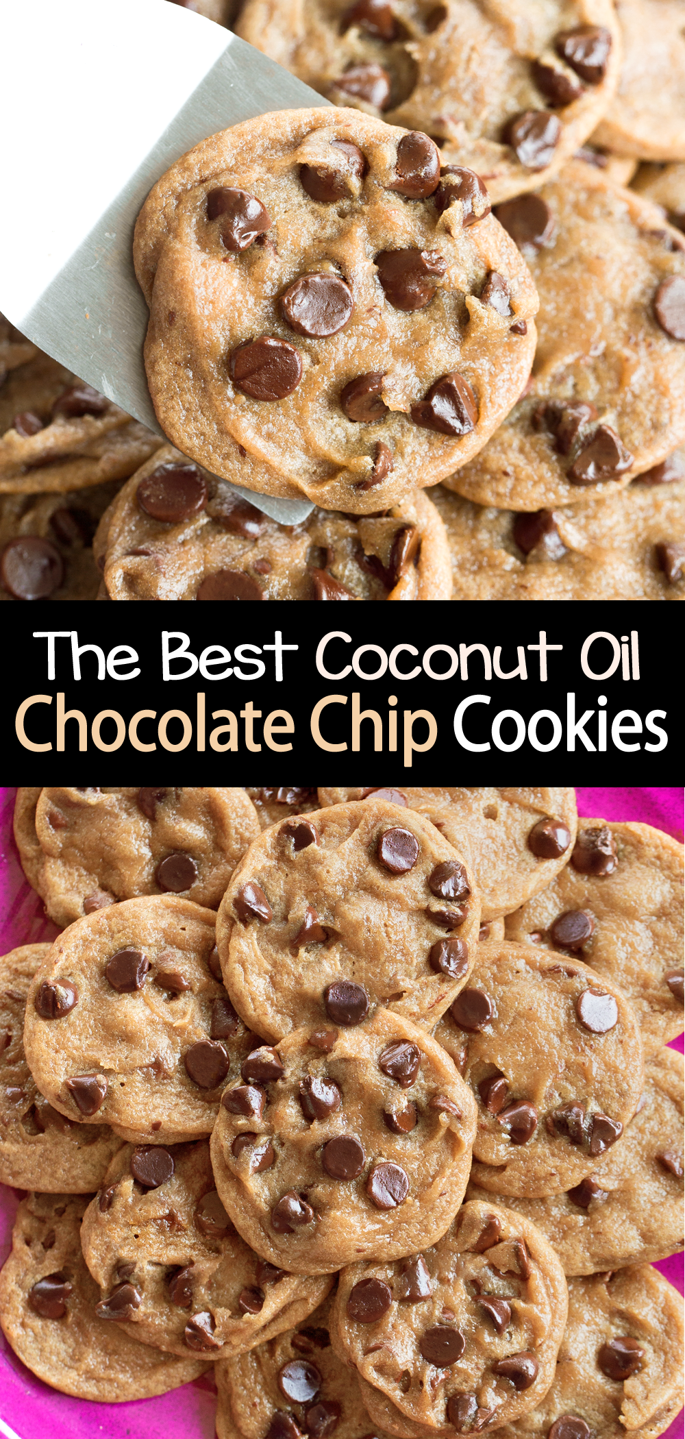 These thick and chewy coconut oil chocolate chip cookies are made with coconut oil instead of butter, and the resulting recipe is absolutely delicious!