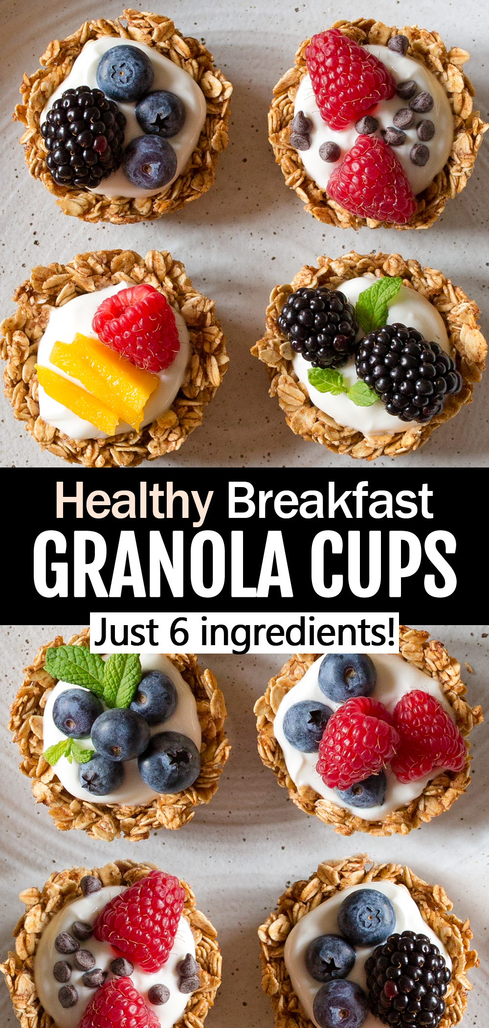 These healthy breakfast granola cups call for just six ingredients, and you can fill them with fruit, yogurt, or anything you wish!