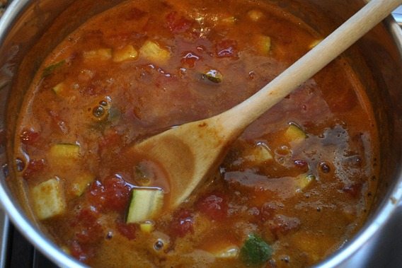 Put everything except optional beans and sour cream in a pot and bring to a boil. Then turn down to low and cook until the veggies are soft. (About an hour and a 1/2, if using zucchini.) You don’t have to watch this as it cooks, so really it only takes about 3 minutes to make!