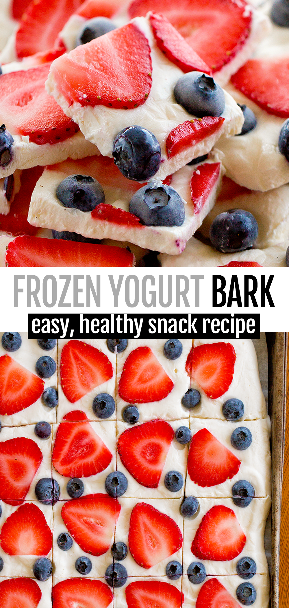This healthy frozen yogurt bark recipe is so easy and fun to make. Top it with fresh summer berries and granola, or add peanut butter and mini chocolate chips!