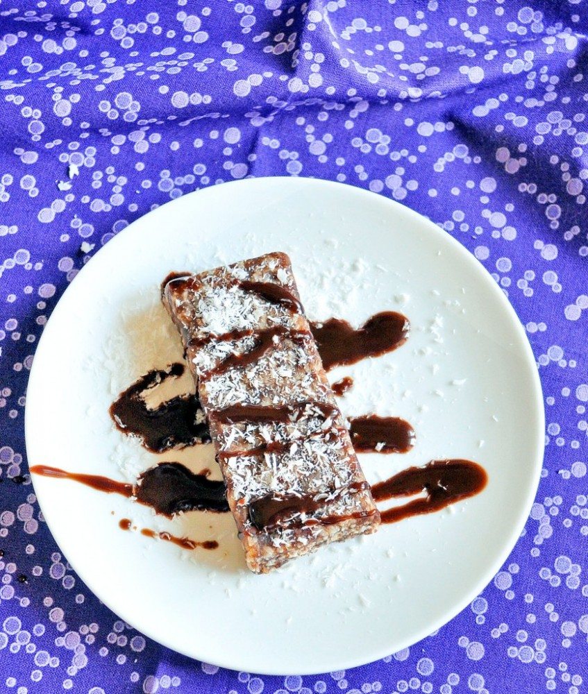It tasted like eating a giant Samoas cookie! I covered a bar in chocolate syrup for the photoshoot. Truly, everything looks better when covered in chocolate. As it happens, everything tastes better when covered in chocolate, too. Three cheers for chocolate. Maybe four cheers.