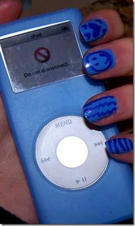 Nail art of the day: I renamed the shade “Ipod blue.” When I went to pick up my ipod, I noticed my nails blended right in. (Please excuse the dirty ipod; he’s been around the block… and then some!)