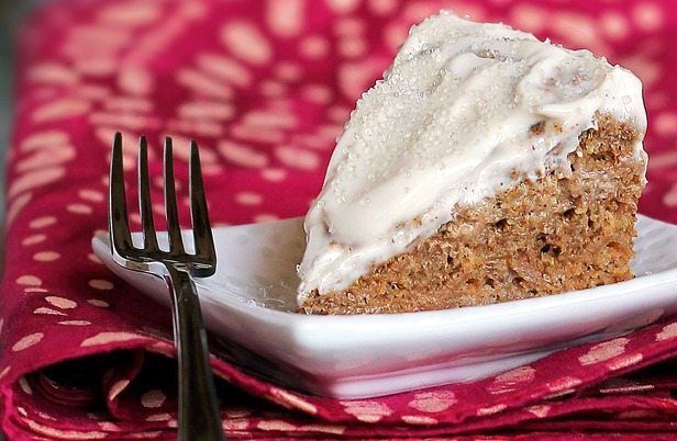 I didn’t actually set out to make it that way. But the batter looked too gooey, after I put in all the applesauce, to add any more liquid. Luckily, this doesn’t taste fat-free (especially when it’s frosted). But you can always replace some of the applesauce with oil if you so desire.