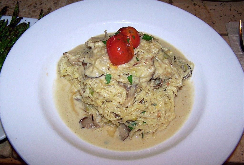 Up until yesterday, I don’t think I’d ever tried cashew Alfredo sauce. So when I saw it on the menu at Cafe Blossom, a vegan restaurant in New York City, I instantly wanted to order Spaghetti Squash Alfredo: maitaki mushrooms, sautéed garlic, leeks, and slow roasted cherry tomatoes, mixed with tender spaghetti squash in a rich cashew cream sauce. I also ordered a side of grilled asparagus.