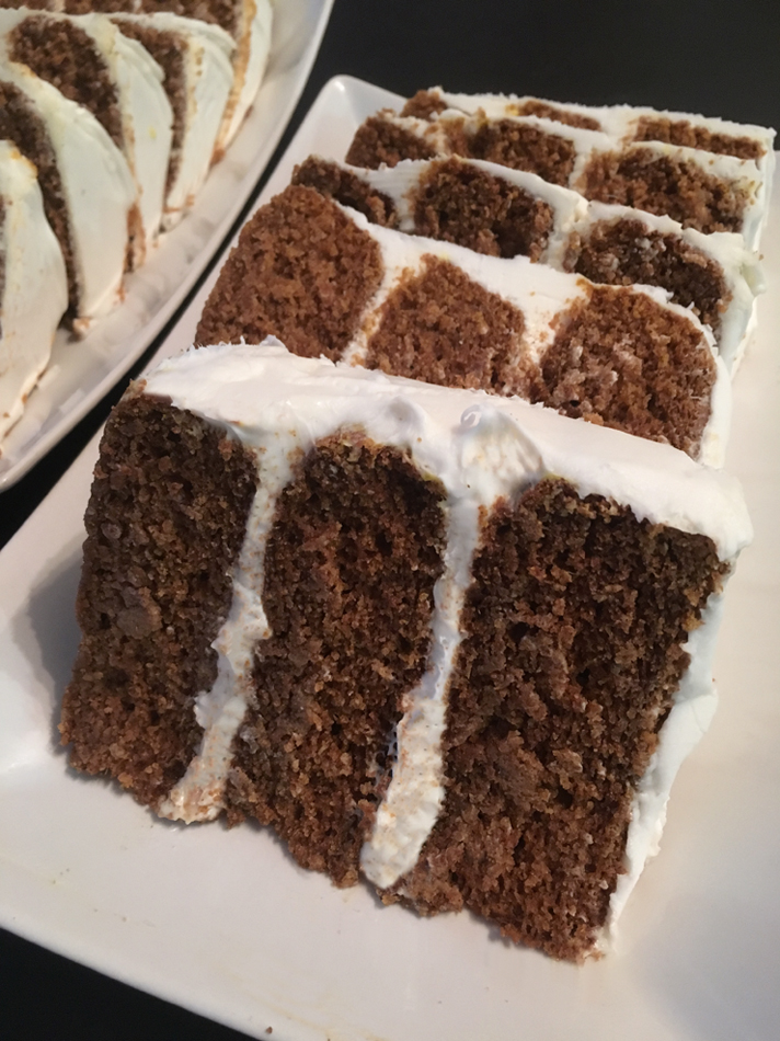 Above is for a cake recipe made in a 9×13 pan (20 servings). Below is for a three-layer cake, as shown in the blog photos and pictured above (10 servings, includes the full cream cheese frosting recipe). While the three-layer version is definitely more indulgent than many of the other desserts on this blog, similar-sized traditional cake recipes (such as ones from Epicurious and Food Network) have close to double the fat and calories, and often more than double the sugar, for the same number of servings.