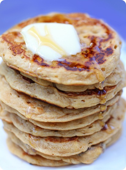 Oatmeal Pancakes Recipe: In a small bowl, combine all dry ingredients and stir very well. In a separate bowl, whisk together all liquid ingredients. Pour dry into wet, and stir together to form a batter. (Note: if the batter is too thin–which might be the case especially if using cup measurements of ww pastry flour–just add a little more flour until you get a pancake-esque batter.) For fluffiest pancakes, let the batter sit in the fridge for 10-15 minutes. Lightly grease a medium skillet, then place over medium heat. When pan is hot (see tip), drop small ladelfuls of batter onto the skillet. Flip pancakes, using a spatula, when the edges begin to look dry. Allow to cook one minute longer, then remove from heat. Serve with your favorite pancake toppings. TIP: Test the heat of your skillet by throwing a few drops of water onto the surface. When the water sizzles, the pan is ready for the pancake batter. Recipe makes about 20 small pancakes, the size of the ones in the photos (3-4 servings).