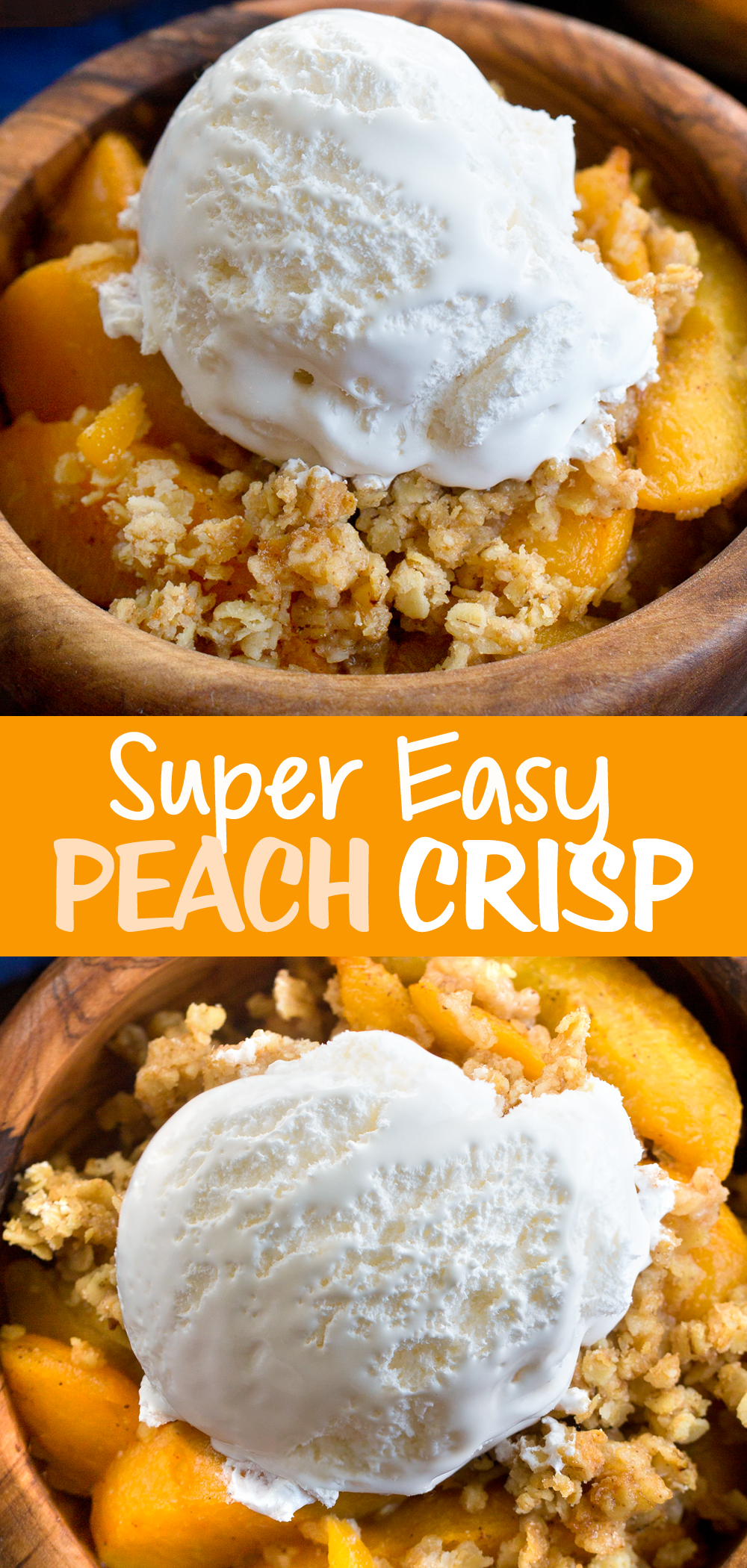 This homemade peach crisp recipe is packed with sweet and juicy peaches and topped with a delicious buttery oatmeal streusel. It’s the perfect easy summer dessert!