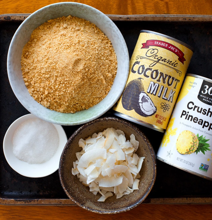 The pineapple: Look for crushed pineapple – I used canned, but fresh is also fine if you want to crush your own in a blender. If you can only find pineapple chunks, those can also be crushed in a blender with a little of the liquid.