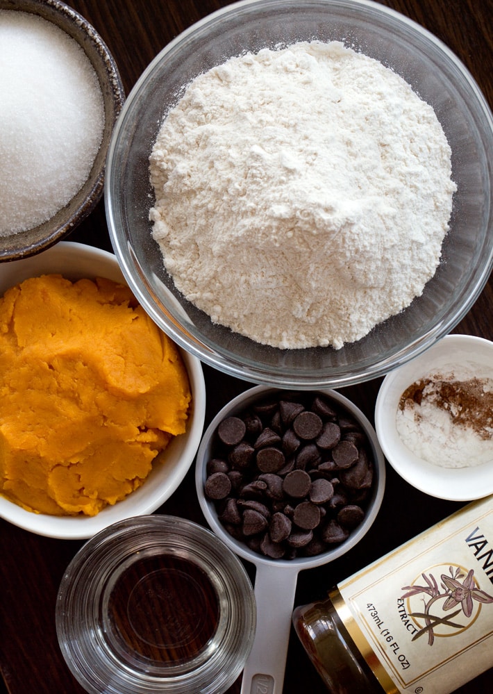 Here is everything you need: fresh or canned pumpkin puree, milk of choice, white or apple cider vinegar, pure vanilla extract, flour, sugar, cinnamon, pumpkin spice, baking soda, salt, baking powder, and optional oil.