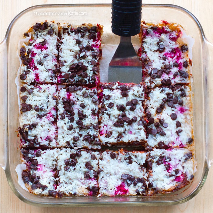 - *Some of the readers who made the recipe have loved the bars as-is, but a few asked how to make the crust more like traditional Magic Square crust. If you want a crust that is less soft, just include the optional 3 tbsp oil or buttery spread with the graham cracker crumbs before pressing down.Line an 8-inch square pan with parchment paper going a little up each side. Preheat oven to 350 F. In a bowl, toss the cracker crumbs with the sweetener and optional oil (and water if using stevia and no oil). Transfer evenly to the bottom of the pan. Press down. Mash the berries. Spread over top (see the video). Sprinkle on half the chocolate chips, then the coconut, then the remaining chips. Evenly pour the coconut milk over top. Place in the oven. Bake 33 minutes. Remove and let sit 15 minutes to firm up. Slice into bars, wiping the knife after each cut. (As mentioned in the post, I initially cut 12 bars but then we ended up making them into 20 bars for the party. So size is up to you!)View Nutrition Facts