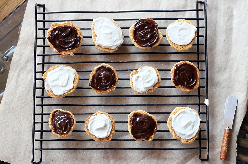 Preheat oven to 375 F. Mix vinegar into milk, and set aside. In a separate bowl, combine dry ingredients and mix very well. Then put all the other liquid ingredients into the vinegar mixture and stir. Pour wet into dry, and stir to combine. Drop tiny circles (a little over the size of a silver dollar) onto 1 or 2 cookie trays. (Or, if you have a whoopie pie maker, you can use that! I don’t have one.) Bake around 8 minutes.