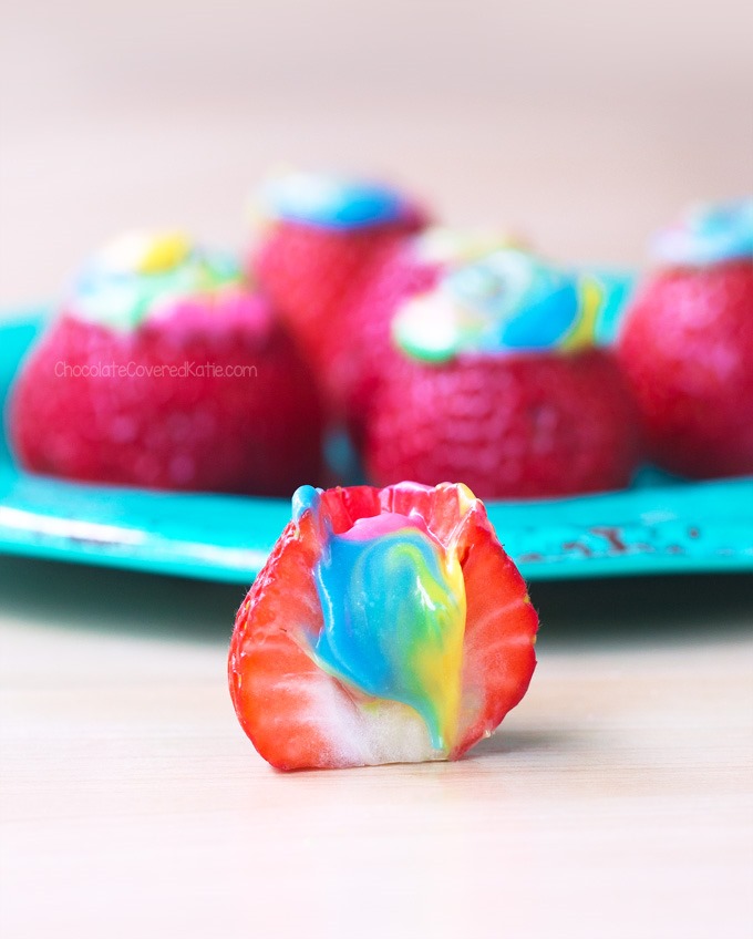 - Option two is to fill the berries with my Rainbow Unicorn Dip recipe.