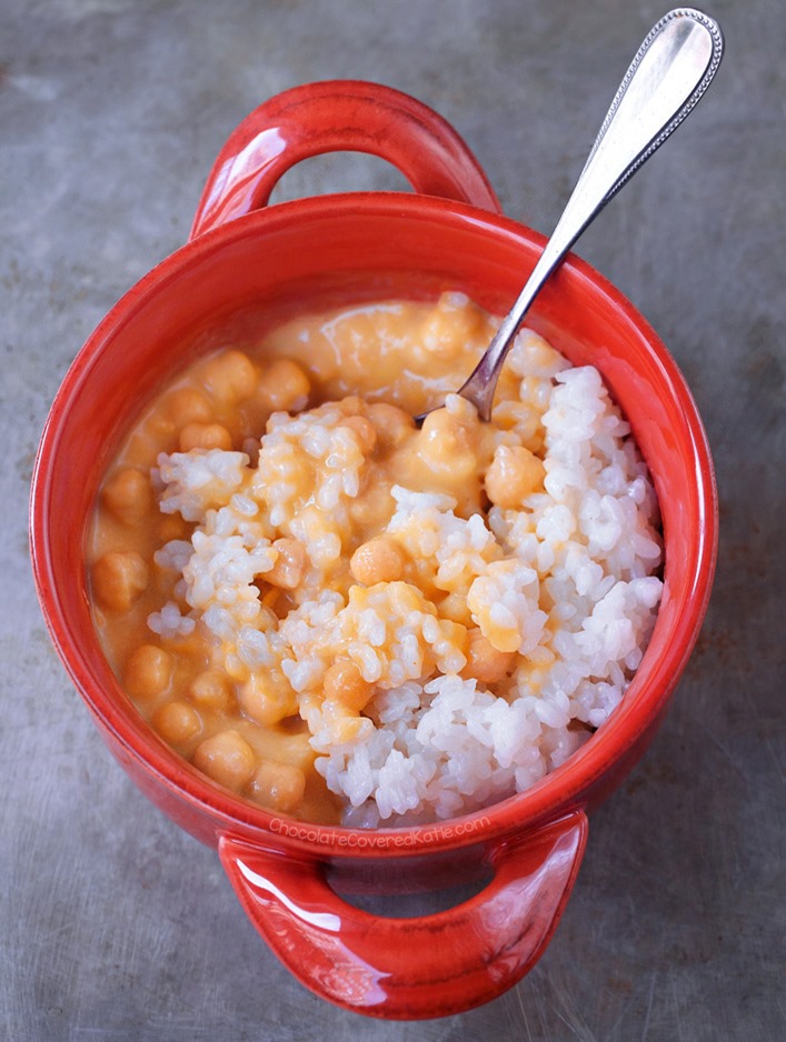 This happens to me often; I’ll get wrapped up in a project, and suddenly it will be dark outside before I’ve even thought about what to make for dinner. These are the times when I’ll find myself falling back on quick & easy recipes like today’s cheesy chickpeas, where the entire meal can come together in 15 minutes flat. When you’re already hungry, the last thing you want to do is wait an hour or more for your meal to be ready.