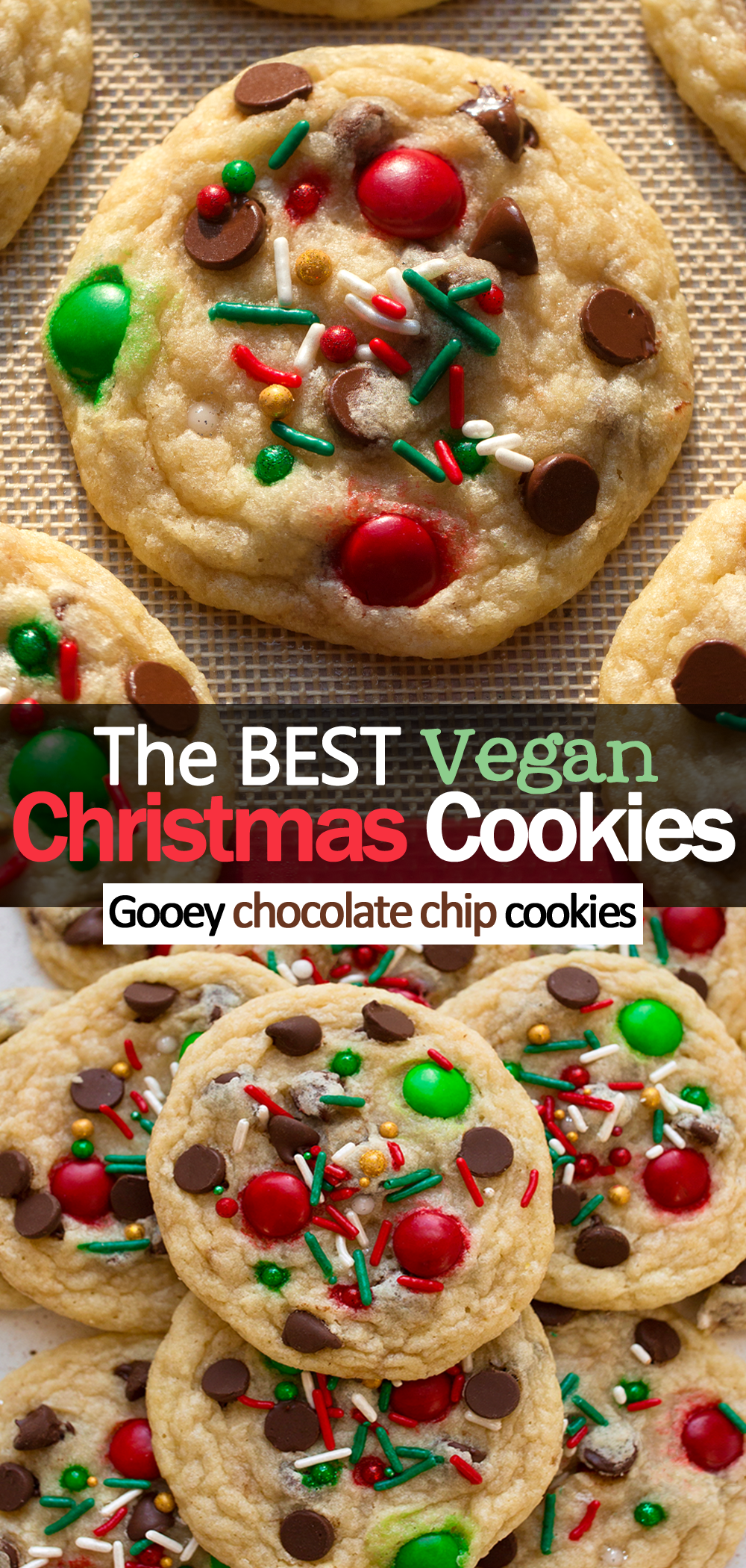 These vegan Christmas cookies are thick, soft, and perfectly chewy. Plus they are packed with gooey chocolate chips and holiday flavor in each delicious bite!