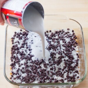Line an 8-inch square pan with parchment paper going a little up each side. Preheat oven to 350 F. In a bowl, toss the graham cracker crumbs with the sweetener (and water if using stevia), then transfer evenly to the bottom of the prepared pan. Press down. Sprinkle the chocolate chips, dates, coconut, and optional nuts over top. Now evenly pour the coconut milk over top. Place in the oven. Bake 33 minutes. Remove from the oven and let sit 10-15 minutes to firm up. (If still too soft for some reason, they also get much firmer if you refrigerate overnight.) Slice into bars, wiping the knife after each cut.