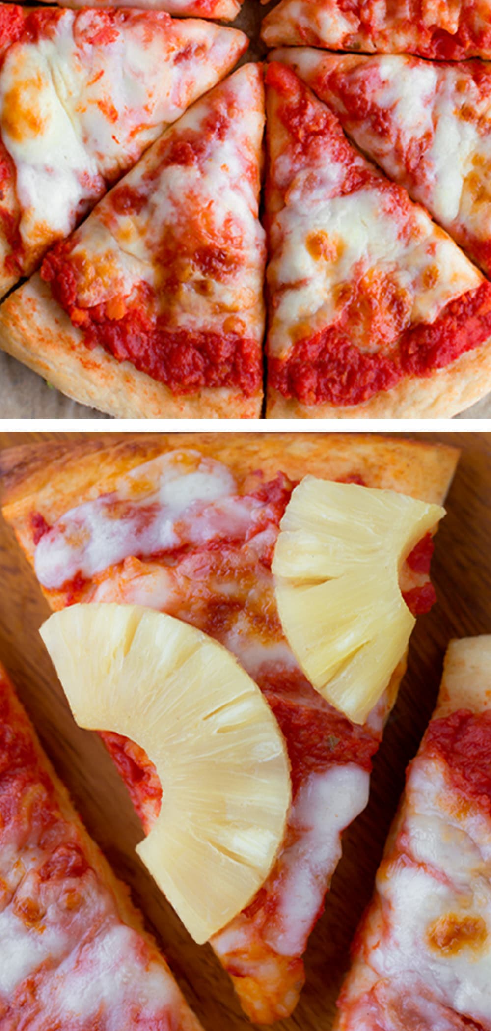 Hawaiian Pizza: Sliced pineapple, tomato sauce, vegan cheese, optional veg bacon bits