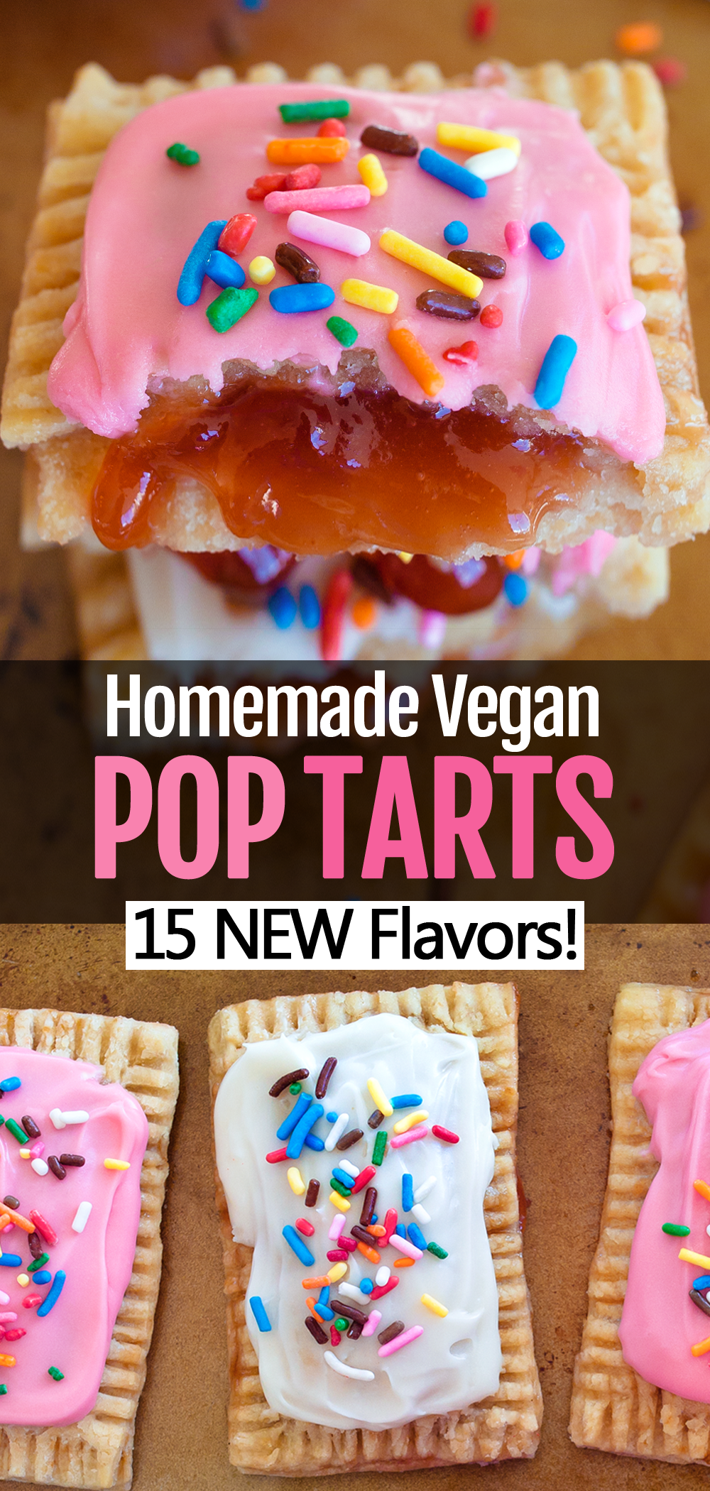- To make vegan pop tarts, first grease a baking sheet or line it with parchment paper. Chill the vegan butter, then cut into small pieces. Stir the flour, sugar, and salt in a large bowl until well combined. Use a food processor or pastry cutter to cut in the butter until the dough forms pie shaped pieces. Then cut in the cold water. Smush into one giant ball, and refrigerate or freeze until cold. Stir together the jam and cornstarch, and preheat the oven to 350 F. Thinly roll out the chilled dough on a floured surface. Cut into an even number of rectangles. Gather any leftover scraps of dough to roll out again. Place the rectangles on the baking sheet, then add about two teaspoons of filling to half of the shapes. Place remaining rectangles on top and use a fork to cinch the sides closed. Poke a few holes in the tops. Bake on the center rack for 15 minutes. Let cool. Vegan frosting recipes are included above.View Nutrition Facts