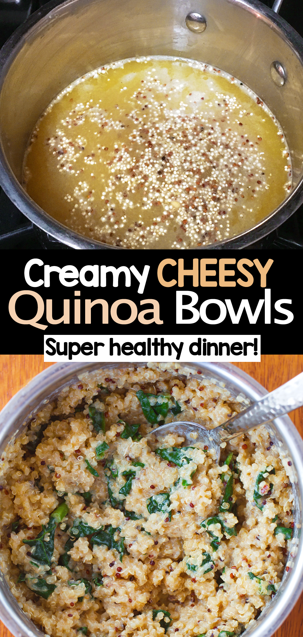 A simple, savory, and wholesome meal in a bowl, this vegan cheesy kale quinoa recipe is pure healthy comfort food!