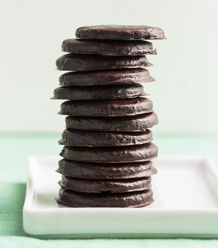 In a large bowl, combine the flour, cocoa, sugar, baking soda, and salt, and stir very well. Whisk together all remaining cookie ingredients, pour wet into dry, and stir to form a dough. Refrigerate dough at least 1 hour (skip this step if using coconut oil). Preheat oven to 300 F. Lightly grease a baking sheet. Transfer dough to a gallon-sized ziploc and smush to form a ball. While the dough is still in the bag, roll it out with a rolling pin until it fills the bag. Entirely cut away one side of the bag so that the dough is exposed. Using a round cookie cutter or a lid, cut out circles and transfer to the baking sheet. Bake 10 minutes. They will look underdone, but they continue to cook as they cool. Remove from the oven and allow to cool at least 10 minutes before removing. I like to then chill the cookies so the coating instantly adheres when they're dipped. Dip cookies in chocolate coating. Place on a large plate lined with wax or parchment, and refrigerate to set. These cookies are best stored in a covered container in the freezer, because freezing them will give the cookies that classic thin mint crispiness… and also because thin mints are always better straight from the freezer!